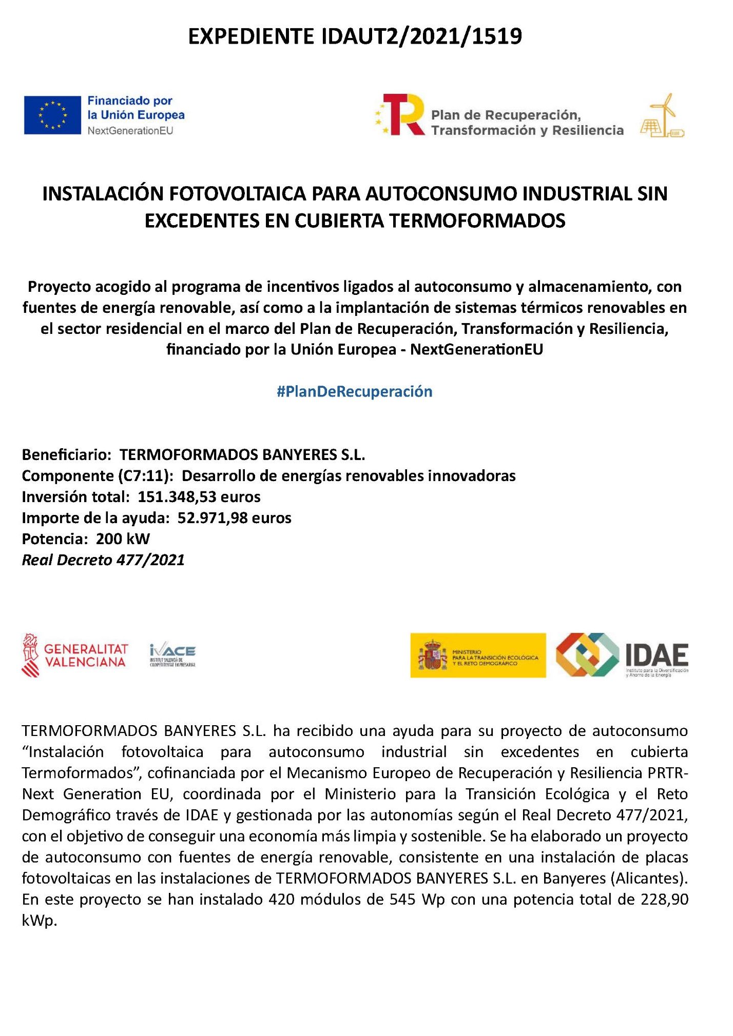 Este proyecto ha sido posible gracias al respaldo del programa de incentivos que promueve el autoconsumo, el almacenamiento de energía y la incorporación de sistemas térmicos renovables en el sector residencial. Se trata de una iniciativa que forma parte del Plan de Recuperación, Transformación y Resiliencia, financiado por la Unión Europea a través del fondo NextGenerationEU.